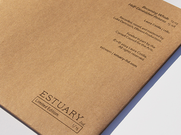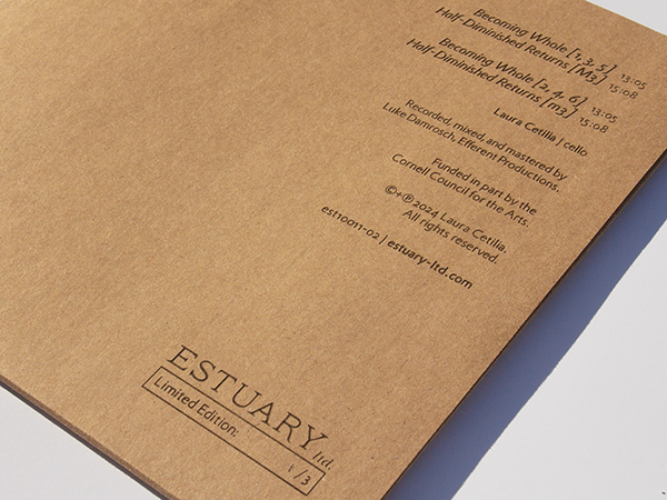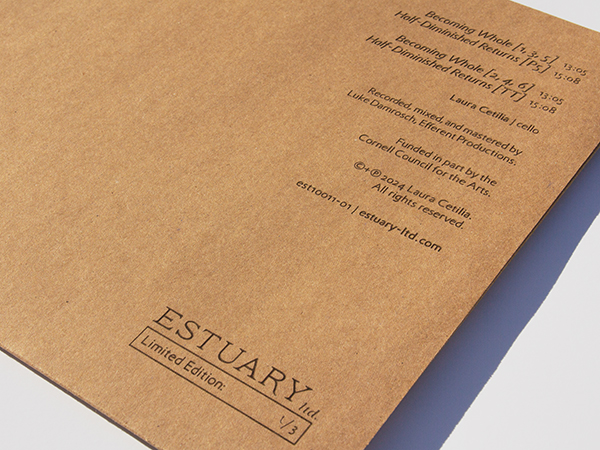 On the other end of the spectrum, “Half-Diminished Returns” descends through the harmonic series of four multi-tracked cellos tuned to the pitches of a half-diminished chord. Despite the historical use of this chord for its “quintessentially dramatic” character, Cetilia’s composition and performance transforms the sonority into soothing velvety pads when played as hushed tones of the natural harmonics of the cello. The music gracefully glides through each overtone and the quiet noise in between, patiently cycling through their suppleness and otherworldly aural charms.