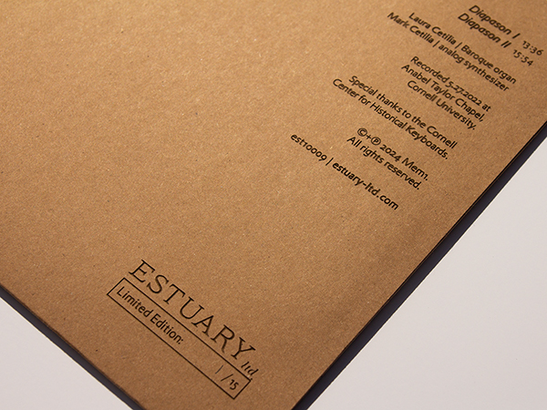 Diapason effortlessly combines sound-making technologies created at a distance of over two centuries using instruments collected and maintained by Cornell University’s Center for Historical Keyboards in Ithaca, NY. Divesting from Mem1’s quintessential instrumentation (cello/voice and analog modular/electronics) to engage keyboard-based instruments anew, Laura Cetilia explores the Center’s recreation of an 18th century organ from the Charlottenburg Palace in Berlin destroyed during World War II with an ear keenly tuned to how notes from the organ breathe and bend, while Mark Cetilia utilizes the unique circuitry of the Center’s original Minimoog Model D and Juno 60 synthesizers to generate complex soundfields pulsating in time with the organ.